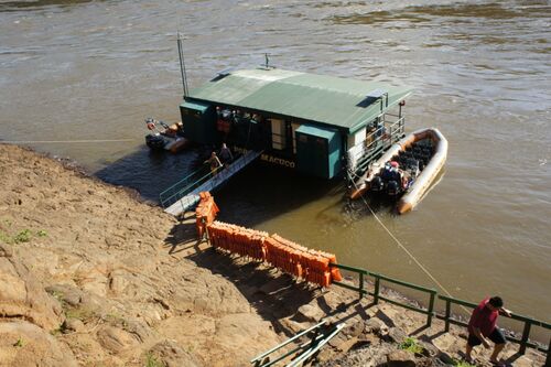 滝壺に架かる橋やら滝壺を覗きこむ展望台から十分瀑布の凄さを観た後は、ボート・ツアーが待っていた。 ジャングルを専用車で下った先に、川幅が広がった岸壁にゴムボートが数隻係留してあった。 我々と入れ違いに上陸してくる若者たちは全身ずぶ濡れ。満足…