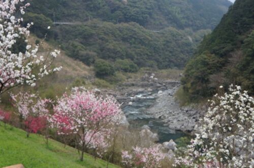 朝朝食を美味しく頂いて、ひょうたん桜を目指す。ところが33号線を高知方面に少し戻った、引地橋あたりに、花桃も一群を発見。早速車を止めて土手を駆け下りる。 眼下、仁淀川の本流も見えて、それはそれは美しい。